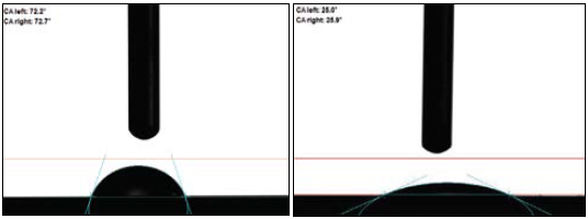 Tests illustrated in Figures 6 and 7 focus on technical evaluations designed to assess the static performance of the fluid intended for use as an RPM. Contact angle measurements provide insights into the affinity of the treated surface (such as the target rock) with the fluid under scrutiny. Additionally, the behavior of formation sand in response to the treatment is evaluated; dispersion in an aqueous environment and agglomeration in an oily environment suggest that the treatment renders the sand predominantly water wet.