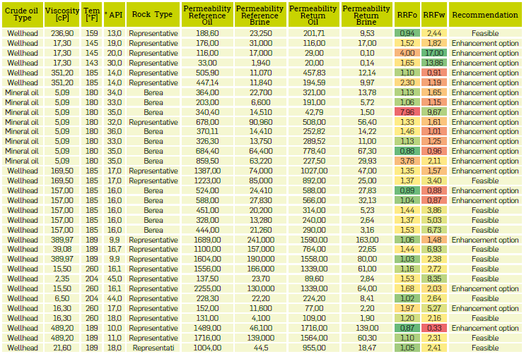 Finally, the study estimates the volume of water that remains unproduced, correlating this with a reduction in water discharges. Data Collection: over the years, the Universidad Industrial de Santander has collaborated extensively with the Oil & Gas sector, focusing on evaluating the impact of Relative Permeability Modifiers (RPMs) on relative permeability curves. Table 1 summarizes numerous results from these collaborations, primarily using crude oil from target formations with viscosities ranging from 2 to 400 cP (at reservoir conditions) and API gravities between 9° and 45°. These evaluations typically involve preliminary processes leading to the rock-fluid interaction stage (core flooding). Various tests are conducted to assess the chemical agent effects on formation fluids at a static level, including visual wettability, compatibility, interfacial tension, detergency, and contact angle assessments, among others. Figure 3 outlines a standardized protocol for selecting an RPM treatment. This protocol progresses from the initial characterization of rock, fluids, and chemicals to assessing fluid-fluid interaction. This approach helps identify potential damage scenarios arising from the interaction between the treatment mixture and formation fluids. Subsequent tests are conducted in relevant environments to evaluate fluid-rock interaction and the impacts of the treatment itself.