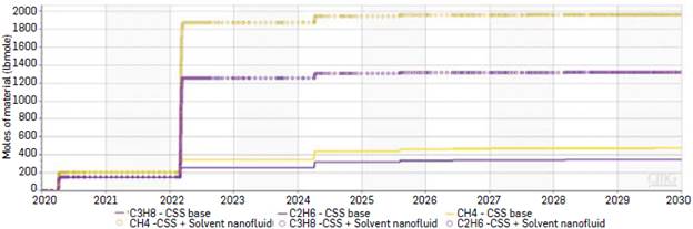 The light gases produced by conventional CSS + Solvent nanofluid are considerably higher than those obtained with CSS base. Table 7 shows the summary of gas production.