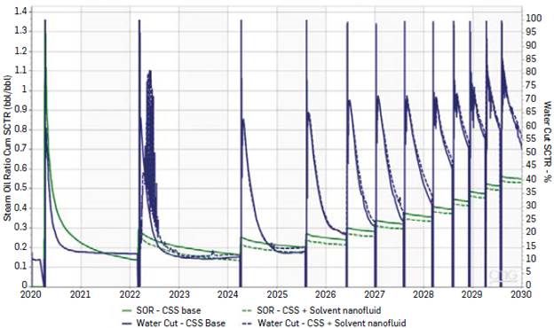 Additionally, Figure 11 shows the cumulative SOR and the water cut instantaneity of the two evaluated scenarios. As observed with the hybrid technology, there is a significant reduction of cumulative SOR, which means that the nanoparticles contribute to incremental oil production with the same injected steam compared to the CSS base scenario. However, the BSW instantaneity compared to the base case increased due to the change in the fluids' movement and the catalytic effect of nanoparticles in the second cycle and the permeability relative curves.