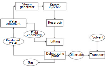 Likewise, as a complement to the environmental impact analysis, Figure 12 shows the flow diagram of the relevant unit operations that occurred in a conventional cyclical steam injection process.