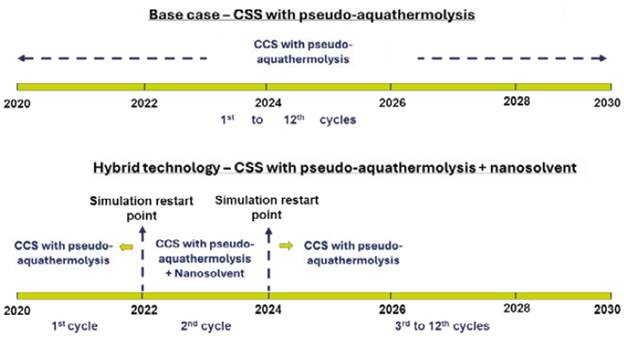 Furthermore, the simulation of nanofluid Injection scenarios Included the keyword "restart" twice: one prior to and the other following its Integration In the second cycle of CCS. The primary Influence is associated with pseudo-aquathermolysis. In the Initial cycle of CCS, a pseudo-aquathermolysis reaction occurs without nanofluid, while in the second cycle, it involves a reaction with nanofluid. Subsequently from the third cycle onward, the pseudo-aquathermolysis reaction without nanofluid is established again (Figure 4).