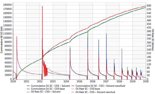 The incremental recovery obtained by hybrid CSS + Hyb-SEN technology implementation in the evaluation period (2020 to 2030) is 3756.46 bbl compared to the conventional CSS base (Figure 6).