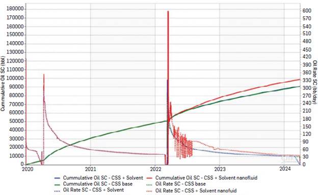 Figure 5 shows the oil production results and daily oil production rates for the CSS baseline, CSS + Solvent and CSS + Hyb-SEN technology.