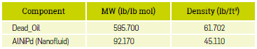 The base fluid model has three components: dead oil, gas in solution, and water. Experimental tests carried out on the crude under study allowed the determination of crude oil average molecular weight and density of naphtha, among others. Table 4 shows the physicochemical properties of the components included.
