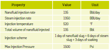 On the other hand, the nanofluid batch Injection rate was calculated concerning the estimated daily steam injection rate in the base case, 1350 bbl/day, with a 10% ratio that is, 135 bbl/day. It hould be mentioned that the amount of steam Injected was the same as the base case, 8100 barrels in each cycle, 60% steam quality, pressure, and temperature conditions equal to those of the base case, and the same soaking time. Table 5 shows the injection-production conditions for the hybrid technology.