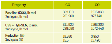 The production of CO obtained by the implementation of the Hyb-SEN for CSS is lower by 52.50 lb mol compared to conventional CSS, which in turn is equivalent to a reduction of approximately 3.95% due to the catalysis of the pseudo-aquathermolysis reaction as evidenced in the experimental tests carried out on the crude in the presence and absence of nanomaterials. For the second cycle, the reduction was 13.9%, with a CO reduction of 144.70 lb mol with respect to CSS.