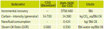 Following the proposed environmental indicators and methodology reported by Osma et al., 2019, the environmental impact calculation was performed for the hybrid technology scenario and baseline. The carbon intensity index results were obtained at this stage considering the CO2 production from steam generation supported by the UPME emissions calculation tool for the scenario evaluated Hyb-SEN, with a steam rate equal to the baseline considering the CO2 generated in the reservoir and due to steam generation. Table 8 shows the results for the CSS baseline and Hyb-SEN for CSS.