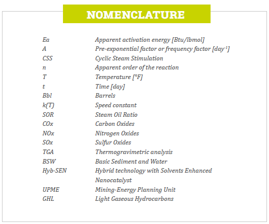To estimate the greenhouse gases for the baseline, the pseudo-aquathermolysis reaction and its kinetic parameters were ncluded, which were determined from experimental tests such as high-pressure thermogravimetric analysis (TGA), reactor tests isoconversional, and gas spectrometry of the reaction products, which were also performed for crude in the presence of the nanocatalysts selected for the hybrid technology called AINiPd.