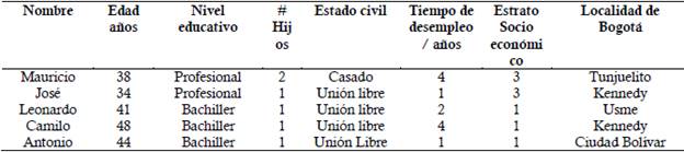 Este trabajo está ubicado epistemológicamente en el paradigma hermenéutico, bajo el diseño de estudio de caso múltiple y exploratorio con enfoque cualitativo desde la perspectiva de Yin (2012), el cual se caracteriza por agotar cuatro pasos: identificar el caso, ubicar los participantes, consolidar el caso y analizar los datos. El estudio comprendió el periodo de tiempo entre enero y diciembre de 2017. El caso se constituyó con cinco varones heterosexuales de Bogotá Colombia de estrato socioeconómico medio y bajo de cuatro localidades de Bogotá Distrito Capital, con rango de edad entre 34 y 48 años y con tiempo de desempleo de 1 a 4 años, como se presenta en el perfil sociodemográfico (Tabla 1).