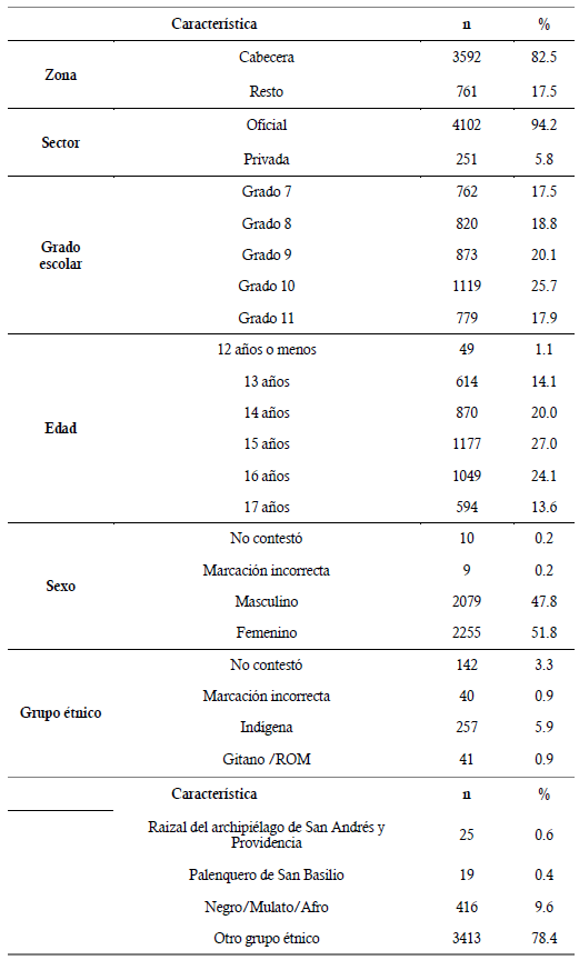 Participaron 4.353 adolescentes del Eje Cafetero entre 12 y 17 años, de los cuales 51.8% son mujeres y 47.8% hombres, de los grados séptimo a undécimo. En la tabla 1 se observan las características de la muestra.
