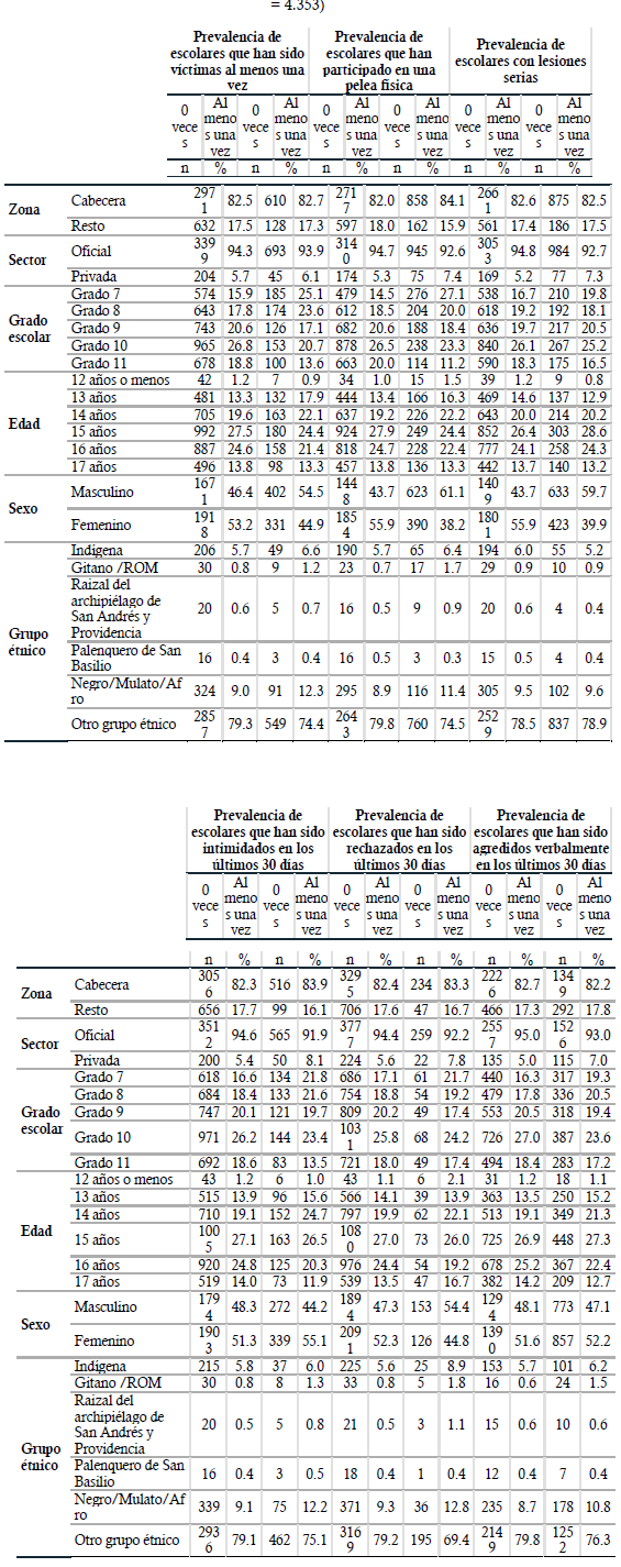 El 24.8% (IC 95% 23.1-25.65) de los escolares encuestados reportaron lesiones serias y el 14.2% (IC 95% 13.09-15.16) indicaron que fueron intimidados el último mes. El 23.5% (IC 95% 22.17-24.69) de estos adolescentes afirman que participaron en una pelea física, y el 17% (IC 95% 15.84-18.07) que han sido víctimas al menos una vez. El 37.9% (IC 95% 36.26-39.14) de los participantes han sido agredidos verbalmente en los últimos 30 días, y el 6.6% (IC 95% 5.72-7.18) han sido rechazados en el último mes. En la tabla 2 se detallan las prevalencias de acuerdo con las características sociodemográficas de los adolescentes cafeteros encuestados.