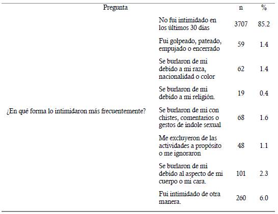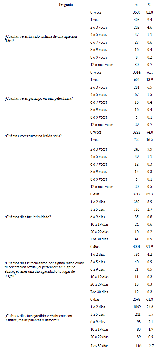 En relación con la intimidación, el 11.6% de los estudiantes fue intimidado entre 1 y 5 días durante el último mes, y el 30.1% fue agredido verbalmente entre 1 y 5 días durante el último mes (tabla 3).