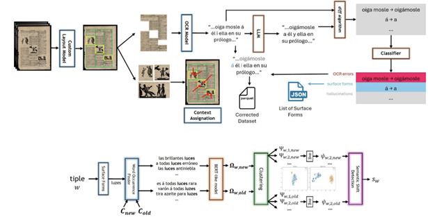 As depicted in Figure 1, ML models were trained to process original archival images, transcribe them using OCR, layout analysis models from computer vision, and leverage LLMs to enhance the transcription of historical newspapers, specifically to the historical nuances of Latin American Spanish. This pipeline then feeds into the SSD framework to extract semantic shifts of specific terms. These models revealed the word tiple as another example of gendered discourse embedded in historical texts. There were two primary meanings of the word tiple in Latin America during the 19th-century. The first is the Colombian traditional musical instrument, which appears only in Colombian newspapers; the second relates to Mexican vedettes. It has long been claimes that the tiple originated as a musical instrument in Colombia-a claim now supported through computational analysis. The Latam XIX newspaper dataset confirms that in Colombia, the term tiple was used exclusively to denote a musical instrument, whereas in Mexico, it carried an entirely different meaning.