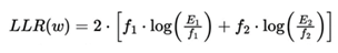 E1 and E2 are the expected frequencies of w in each dataset, assuming a uniform distribution, which can be computed from the total number of words on each dataset N1 and N2, and the total frequency