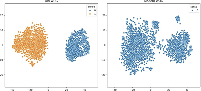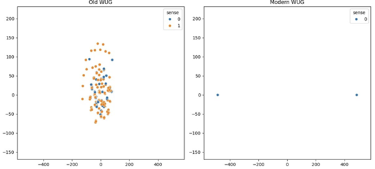 Note: Each color represents a meaning (cluster) of the word. The color changes between the left (old corpus) and right (modern corpus) panels illustrate the overall semantic change between the two diachronic corpora.