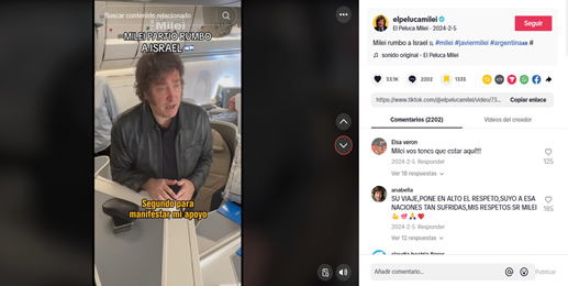Elpelucamilei (@elpelucamilei). 2024. “Milei rumbo a Israel”. TikTok, 5 de febrero. https://www.tiktok.com/@elpelucamilei/video/7332168113070427398Links ]