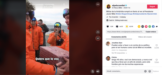 Otro de los videos relevantes es el del 19 de febrero de 2024, en el que, al ser considerado por un periodista como un político más, el líder argentino contestó: “Pero yo sí piso la calle” (@elpelucamilei en TikTok, 19 de febrero de 2024), es decir, el “héroe” no puede ser al mismo tiempo el “villano”, porque eso implicaría traicionar al “pueblo”.