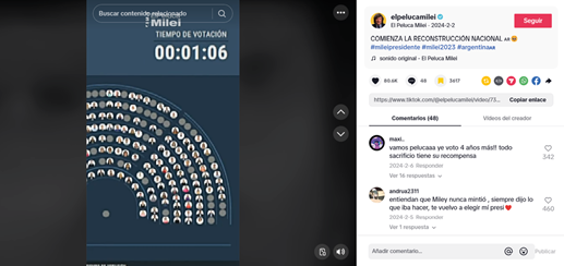 Las publicaciones en la cuenta oficial son escasas y no utilizan videos con la lógica de TikTok, los cuales suelen mezclar humor, entretenimiento y música (Ariza et al. 2023). No obstante, eso no les impide acumular millones de vistas; aunque sí llama la atención que una personalidad que tuvo éxito en la televisión tradicional, y que tiene un estilo polémico propio de las dinámicas de viralización, no explote esas mismas cualidades en una plataforma tan importante como TikTok, más aún si se toma en cuenta que dicha plataforma es de las más utilizadas por los jóvenes, base de apoyo importante para Milei. También llama la atención que, prácticamente, no hay menciones a su partido, lo que confirma el protagonismo del líder argentino.
