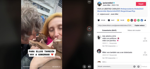 Elpelucamilei (@elpelucamilei). 2023. “El amor que siente Milei por sus Perros es único. Solo un político sin corazón como Massa puede meterse con sus mascotas para ganar una elección”. TikTok, 11 de septiembre. https://www.tiktok.com/@elpelucamilei/video/7277704406596865285Links ]