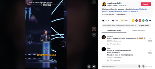 Elpelucamilei (@elpelucamilei). 2023. “Milei explotó contra Massa en el debate”. TikTok, 13 de noviembre. https://www.tiktok.com/@elpelucamilei/video/7301005424650702085Links ]