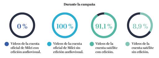 Durante el periodo estudiado, la cuenta oficial de Javier Milei (@javiermileii) publicó un total de 19 videos, de los cuales 11 corresponden a la época de campaña y 8 a los primeros cien días en el gobierno. Por su parte, la cuenta satélite o de apoyo (@elpelucamilei) publicó un total de 45 videos durante la campaña y 61 ya como presidente en funciones, además, diversificó más el contenido y lo adaptó a los formatos de TikTok (en cuanto a música, cortes dinámicos, edición visual, etc.).