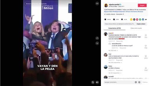 Elpelucamilei (@elpelucamilei). 2023. “Si ellos se unieron para ponerle fin a Sergio Massa, el 19 de Noviembre tenemos que ir a votar todos en contra de la continuidad del Kirchnerismo”. TikTok, 30 de octubre. https://www.tiktok.com/@elpelucamilei/video/7295945692617379078Links ]