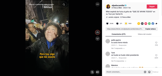 Elpelucamilei (@elpelucamilei). 2023. "Milei explotó de furia al grito de 'QUE SE VAYAN TODOS' en su Tour por Santa Fe". TikTok, 26 de julio. https://www.tiktok.com/@elpelucamilei/video/7260293881609211141Links ]