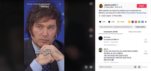 Elpelucamilei (@elpelucamilei). 2023. “Milei explotó con todos los políticos por el asesinato de Morena, una nena de 11 años”. TikTok, 10 de agosto. https://www.tiktok.com/@elpelucamilei/video/7265755900995063045Links ]