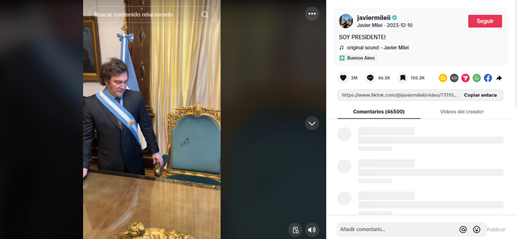 Milei, Javier (@javiermileii). 2023. “VIVA LA LIBERTAD CARAJO!”. TikTok, 24 de octubre. https://www.tiktok.com/@javiermileii/video/7293668140456676614Links ]