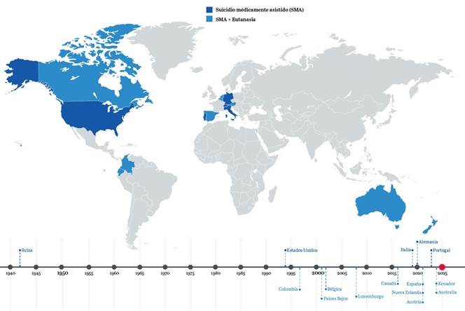 Nota 1: la línea de tiempo considera el año en que se aprobaron por primera vez las leyes sobre muerte asistida en cada país, muchas de las cuales han sido modificadas o ampliadas posteriormente.