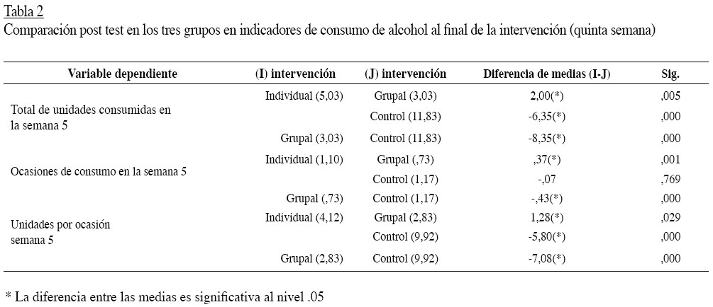 Frecuencia e intensidad de consumo post intervención. Se realizó una comparación entre los indicadores de consumo posteriores a la intervención (quinta semana), a través de un ANOVA en aquellas personas que recibieron intervención grupal e individual y las que no la recibieron (ver tabla 2). Se identifican diferencias significativas en los indicadores de consumo entre el grupo control y los grupos experimentales en dirección a una disminución de los mismos (frecuencia e intensidad) en las personas que recibieron la intervención. Sin embargo, no se encuentran diferencias significativas en la frecuencia de consumo entre el grupo que recibió intervención individual y el grupo control, lo que indica un número de días de consumo similar en las personas que no recibieron intervención y aquéllas que recibieron la intervención individual, aunque éste último grupo consuma menos unidades por ocasión.