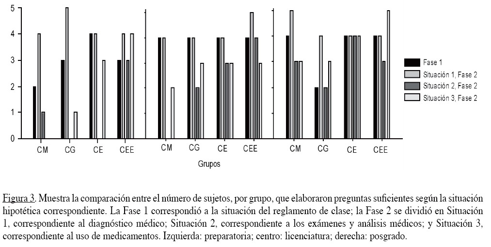 La Figura 3 muestra el número de sujetos que elaboraron preguntas suficientes. En los participantes de preparatoria se observó un efecto de la especificidad del criterio de la Fase 1 a la 2. El efecto fue más claro en el caso del grupo expuesto al CEE, ya que en las tres situaciones de la Fase 2 (S1, S2 y S3) las preguntas que elaboraron incrementaron en suficiencia respecto de las elaboradas en la situación de la Fase 1. Los puntajes más bajos de todos los grupos se observaron en la Situación 2 (S2) de la Fase 2.