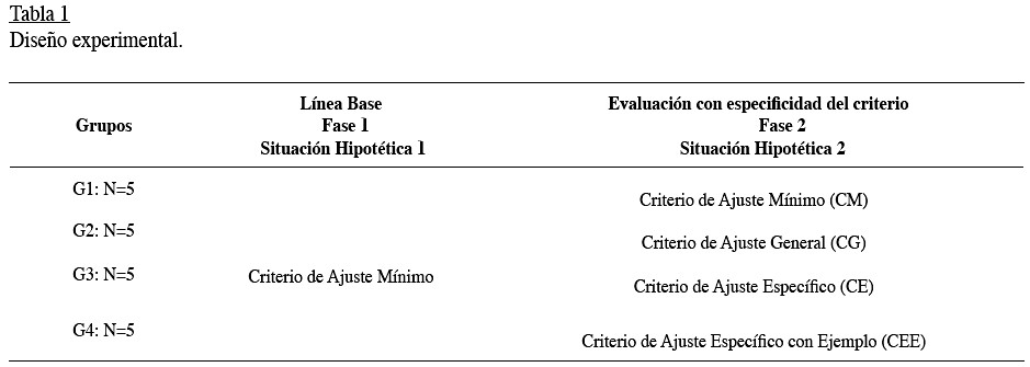 Cada participante se sentó en un pupitre individual en el caso de preparatoria y licenciatura, o en un cubículo aislado en el caso de posgrado. Se dieron indicaciones generales en las que se agradecía la participación a los estudiantes y se indicaba que la tarea debía ser resuelta de manera individual. Posteriormente, a cada sujeto le era entregada una hoja que contenía la Situación Hipotética 1 correspondiente a la Fase 1 del diseño (véase tabla 1). Se pidió a cada participante que indicara al experimentador el momento en el que terminara de resolver la tarea. Cuando el participante indicaba haber terminado tal actividad, se le recogía la hoja con la Situación Hipotética 1 y se le entregaba una segunda hoja que contenía la Situación Hipotética 2, y el texto del tipo de criterio de ajuste que le correspondiera, dependiendo del grupo experimental al que perteneciera, tal y como se indica en el diseño (véase tabla 1).