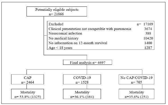 Figure 1 Flowchart analyses. CAP: Community-Acquired Pneumonia; COVID-19: coronavirus disease 2019.