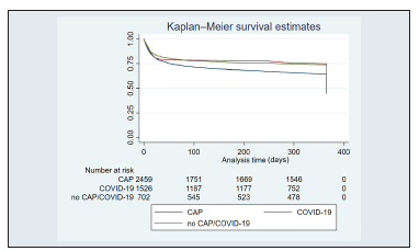 A total of 4697 patients were included, with 52.5% having CAP (2464/4697), 32.5% having COVID-19 (1528/4697), and 15% having neither CAP nor COVID-19 (705/4697). The 12-month survival rate was 46.2% for patients with CAP, 74.9% for patients with COVID-19, and 64.4% for patients with neither con dition. Cox regression analysis revealed that being male (HR:1.142;95%CI:1.042-1.252;p=0.004), age > 65 years (HR:2.622;95%CI:2.324-2.959;p<0.001), Charlson Comorbidity Index ≥3 (HR:1.770;95%CI:1.604-1.954;p<0.001), CURB-65 ≥2 (HR:2.081;95%CI:1.874-2.313;p<0.001), and a history of CAP (HR:1.569; 95%CI:1.420- 1.735;p<0.001) were associated with increased mortality at 12 months.