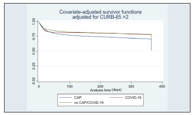 Figure 5 CURB-65 score adjusted survival. CAP: Community-Acquired Pneumonia; COVID-19: coronavirus disease 2019.
