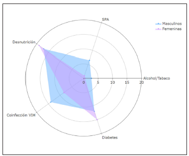 Figura 1 Distribución porcentual de Comorbilidades en pacientes con Tuberculosis según Sexo. SPA: Sustancias Psicoactivas.
