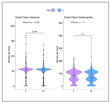 Figura 4 Número de dosis en fase intensiva y fase de continuación en pacientes con tuberculosis según sexo.