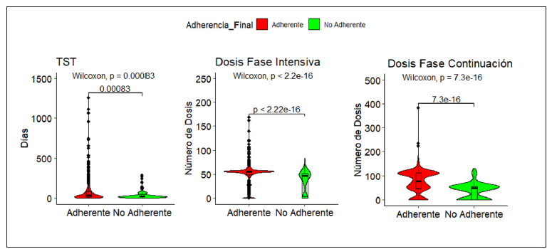 En el grupo de pacientes con VIH (n = 135), se registró uso de quimioprofilaxis en 70/135 pacientes con isoniacida por 6 meses. Por otro lado, se observaron diferencias significativas en la mediana total de dosis tanto en la fase intensiva como en la fase de continuación del tratamiento entre los no adherentes y los adherentes, siendo mayor en el grupo adherente (p < 0.001 en ambos casos) (Figura 5). La mortalidad fue más alta en el grupo de adherentes en comparación con los adherentes, aunque esta diferencia no alcanzó significancia estadística (p = 0.06)
