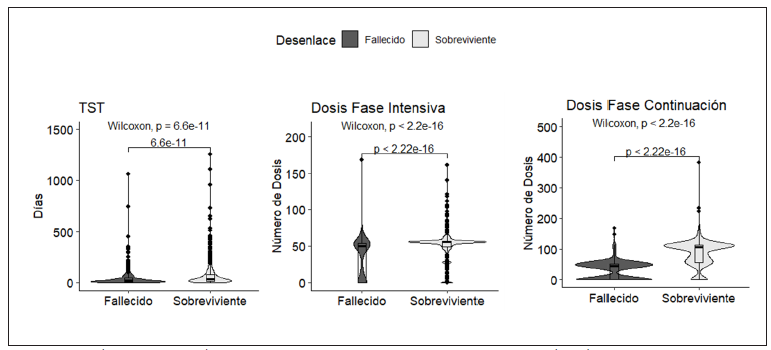 Además, se encontraron diferencias significativas en el tipo de tuberculosis entre los grupos, con una proporción mayor de casos de tuberculosis extrapulmonar entre los fallecidos en comparación con los sobrevivientes (19% vs 11%, p = 0.001). Otros factores como el TAS-T, la infección por VIH, la desnutrición y el uso de SPA también mostraron asociación significativa con la mortalidad: los pacientes fallecidos tenían un TAS-T significativamente menor (21, 0-1060 días vs 37, 0-1257 días) y una mayor prevalencia de infección por VIH (22% vs 8.2%) y desnutrición (25% vs 15%) (all p<0.001 (Figura 6)). Además, los pacientes fallecidos recibieron menos dosis tanto en la fase intensiva como en la fase de continuación del tratamiento en comparación con los sobrevivientes (p<0.001).