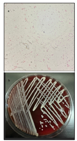Figure 1 a) blood central line cultures in gram stain light microscopic examination showing clusters of gram-negative bacilli. b) Brucella anthropi in blood agar after 48 hours of incubation.