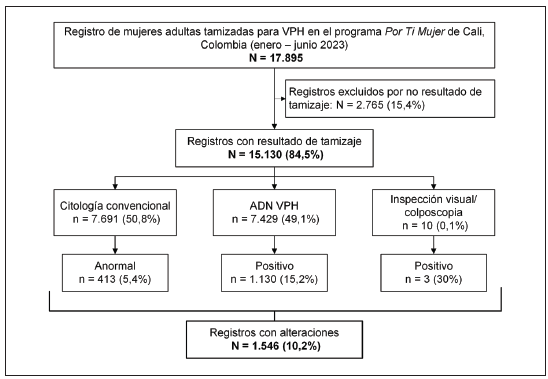 En el periodo evaluado (enero a junio de 2023), hubo 17.895 registros de mujeres con pruebas de tamizaje para VPH en el programa Por Ti Mujer de Cali, Colombia. Tras excluir aquellos registros sin resultado, se analizaron 15.130 registros; la citología convencional y la prueba de ADN VPH aportaron la mayor parte de registros, con 50,8% y 49,1% respectivamente. Se encontraron alteraciones en 5,4% de las pruebas de citología convencional y en el 15,2% de las pruebas de ADN VPH. La prueba de inspección visual sólo aportó 0,1% de resultados10, 3 de los cuales resultaron positivos. En total, se registraron 1.546 (10,2%) resultados con alteraciones en los registros de pruebas de tamizaje (Figura 1).