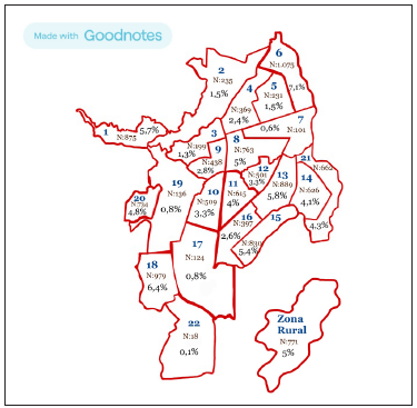 Figura 2 Comunas de la ciudad de Cali, Colombia con el número y porcentaje de mujeres tamizadas en el programa Por Ti Mujer, enero - junio 2023