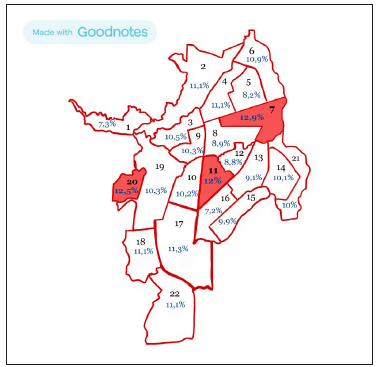 En Cali, las comunas con mayor frecuencia de detección de infección por VPH mediante la prueba ADN VPH como método de tamizaje fueron las comunas 7 (12,9%), 20 (12,5%) y 11 (12%). Mientras que las comunas con menor detección fueron la 1 (7,3%) y 16 (7,2%) (Figura 3). La frecuencia de detección de infección en población residente de zona rural de Cali fue de 10,2%, y el promedio en toda la ciudad fue del 10,2%.