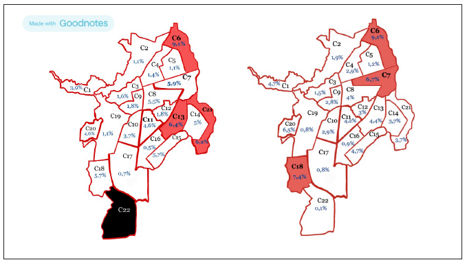Se encontró que el comportamiento de los genotipos de VPH AR cubiertos por la vacuna del programa ampliado de inmunizaciones (PAI) (Genotipo 16-18) variaba frente aquellos no cubiertos, el índice de frecuencia más alto de los genotipos 16 y 18 en las pruebas de tamizaje se registraron principalmente en las comunas del oriente de la ciudad de Cali, sobresaliendo las comunas 6 (9,1%), 13 (6,4%) y 21 (6,2%), mientras que no se encontraron registros de estos genotipos en la comuna 22. Los genotipos de VPH AR que no son cubiertos por la vacuna incluida en el PAI, estuvieron presentes en residentes de todas las comunas de la ciudad, con una frecuencia desde 0,1% en comuna 22, hasta 9,1% en la comuna 6 (Figura 5).