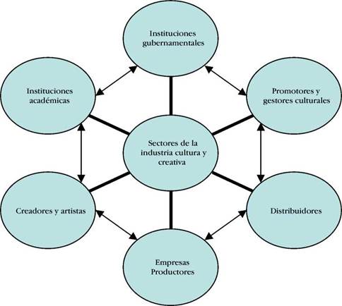 De acuerdo con la figura 2, si bien se mencionan cada uno de los actores, se está dejando de lado, por una parte, la movilidad que cada uno de ellos logra tener, sabiendo que no solo se puede incurrir en una de estas esferas; por otra, se está dejando de lado la existencia de herramientas, actores e instrumentos variados que determinan cada una de las fases de producción y comercialización de bienes y servicios creativos y que movilizan y facilitan su expansión en los mercados internacionales.
