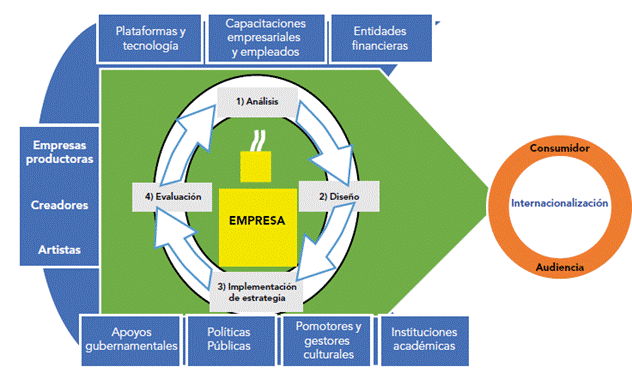 La anterior tripartita o trípode es esencial, compuesto por la empresa, los procesos tradicionales de internacionalización y el ecosistema creativo, pues hace que los negocios culturales tengan interacción con los actores del ecosistema, que provee las herramientas y estrategias necesarias para fortalecer a las empresas desarrolladas en la industria cultural y creativa, y que buscan internacionalizarse como mecanismo de fortalecimiento, ingresos y competitividad.