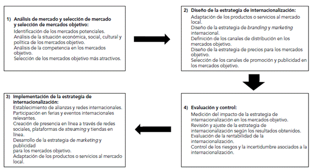 Este esquema de internacionalización para una empresa del sector de las industrias culturales y creativas se enfoca en el análisis de mercado y selección de mercados objetivo, diseño de la estrategia, implementación y evaluación y control de la estrategia, que permitirá a la empresa tener un rumbo claro en el proceso. Además, lo anterior se convierte en un paso a paso de cada una de las etapas para tener éxito, por cuanto “el concepto de internacionalización implica, por una parte, un reconocimiento y posicionamiento de lo local y nacional en escenarios internacionales relevantes” (Idartes, 2021, p. 35).