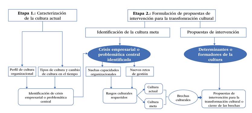 El estudio se realizó en dos etapas: la primera correspondió a la caracterización de la cultura organizacional actual de la empresa, y la segunda, a la formulación de propuestas para la transformación cultural (figura 1). A continuación, se describen en detalle cada una de las etapas.